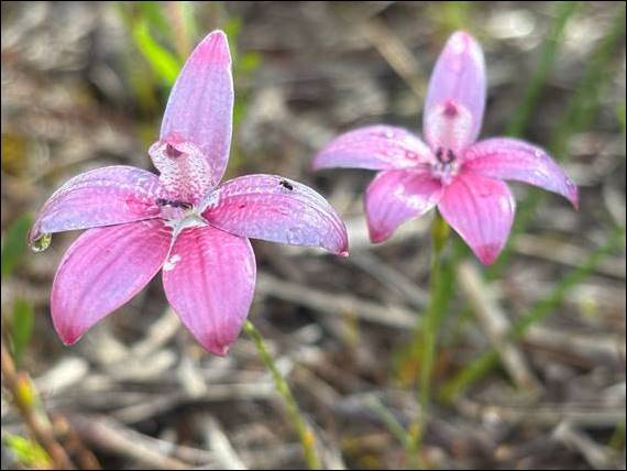 Honey Possum’s are pretty high on my list of mammals to see. And while I kept an eye out for any signs of movement on the bright yellow candlesticks my hopes were not high, as they generally emerge at dusk and feed at night. In the shade of the trees to the right in the image below is one of many Bushy Boronia (Boronia fastigiata) I found in flower. Seeing so many of these small pink flowers, I almost didn’t pay any attention to the two pink flowers near the base of the image that are Pink Enamel Orchids (Elythranthera emarginata):