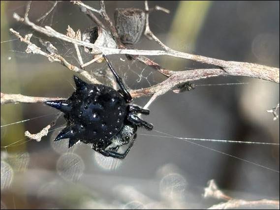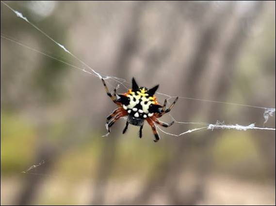 The above image, and a few others in this post, is a little out of focus. As I mostly take my images with a phone, I’m not apologising. The tiny spiders at approx. 10mm wide are hard to focus on at the best of times, and even more so when it is windy. The true common name is a Jewel Spider (Austracantha minax subsp. minax), for the obvious reason. The origins of the names are worth a mention. The genus coming from the Latin auster and Greek ákantha, meaning south and thorn, and species from the Latin mināx meaning jutting out or projecting: