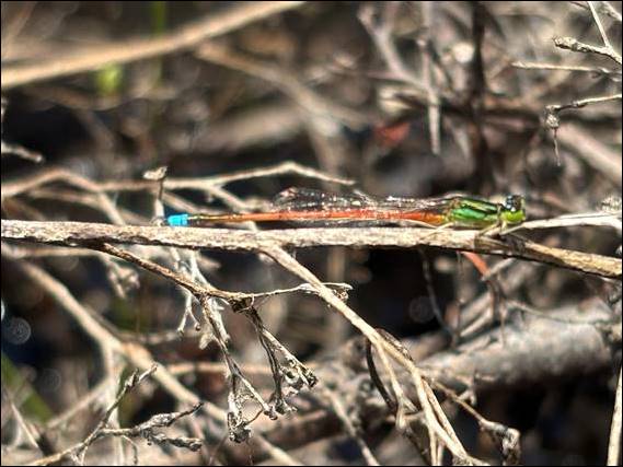 Today I went to the wetlands area. Not surprisingly, after the rainfall we’ve had this year that has continued long into spring, there was plenty of water about. As such I had to watch my path ahead as well as where I was putting my feet. I gave up trying to avoid getting wet feet, but every so often I’d see things rapidly moving away. Loads of ting froglets, with a body no bigger than my thumb nail were frantically getting out of my way. Too difficult to even try and identify, while the Aurora Blue-Tail Damselfly (Ischnura aurora) was an easy identification: