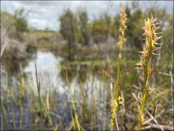 Quite an apt find considering the recent aurora events we’ve experienced. I found lots of males displaying their a stunning array of colours and just a few females, which are a pale grey. Trudging through the water another apt find was the Swamp Leek Orchid (Prasophyllum drummondii), shown above. Often found growing in standing water, as it was today, and worth getting my feet wet for. This is a species I do not recall seeing before so a good find, and today there were hundreds out. There was however only one of these: