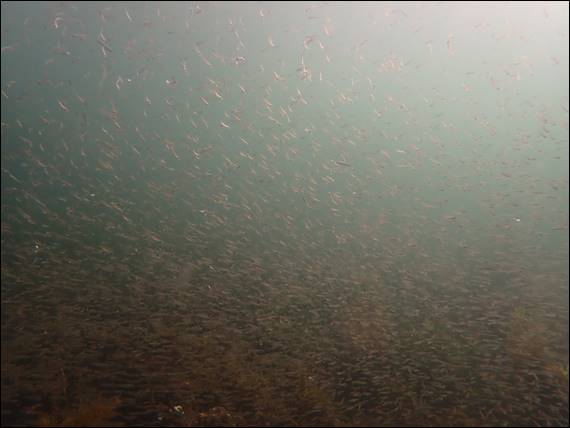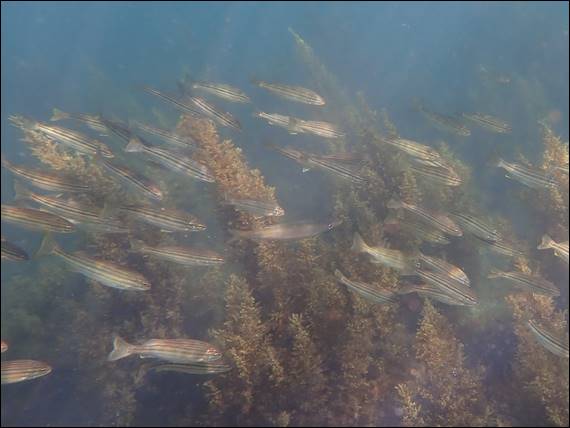 If you check the third image you may spot a single Yelloweye Mullet (Aldrichetta forsteri), hidden amongst the Western Striped Grunters. The big googly eye, along with the body shape and patterning makes me think I have the right identification. A popular angling fish, they are the most common mullet in southern Australia and like similar environments to the Western Striped Grunters. Shortly after I came across a massive ball of baitfish. The low sun and fine particles in the water column meant the image does not give the sight justice: