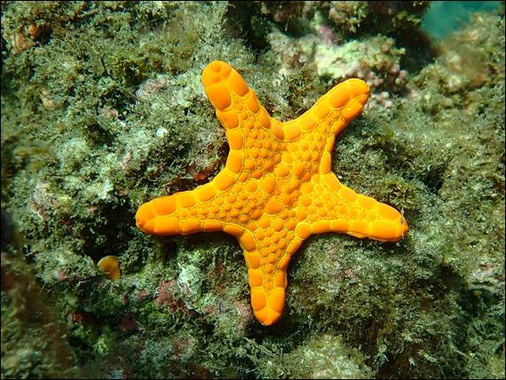 As drifted further out a third schooling species appeared and followed me for a bit. I think they are Silver Trevally (Pseudocaranx georgianus), another species that moves to deeper waters as they mature. If I am right with the identification these are likely to be sub-adults because for the first 3 to 4 years, of their 20 plus year lifespan, they have a yellow mid-lateral stripe. And this was absent from the ones I saw. While the bright orange of the above Vermillion Seastar (Pentagonaster duebeni) was however impossible to miss: