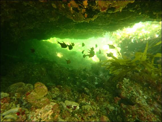 Like the Southern Eagle Ray I too slowly carried on. Making my way out, past the limestone pillars sticking out of the water, and then disappearing from Lisa’s sight round the headland. The reef was as good as it looked from the café. Lots of shelves and caves to explore. Not wasting the opportunity, I checked out quite a few of them but found surprisingly little. The fish life was way less than yesterday’s dive back at Peppy Beach, although the change in ground and a bit of a different makeup of marine vegetation made up for it: