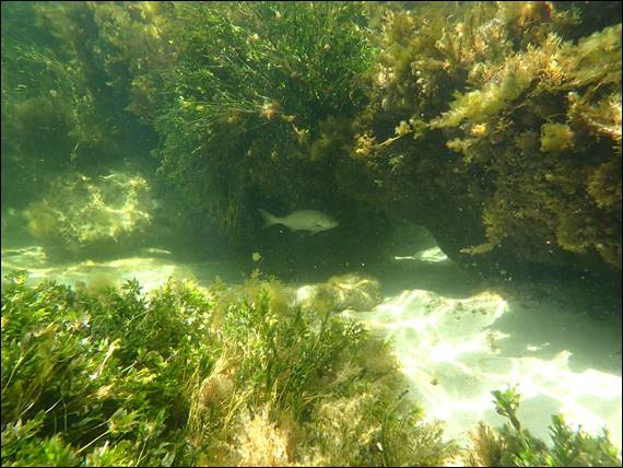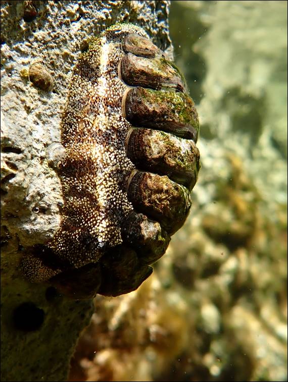 The reef is made up of limestone, and I noticed that the vertical walls were mostly clear of weed. Being covered with limpets and what I believe are Giant Chiton (Plaxiphora albida). There are around 1,000 worldwide and about 150 species in Australia, many being endemic, so I cannot be completely sure. They are a kind of mollusc, protected by a ‘coat-of-mail’ shell with eight segments. Described as a primitive animal that is believed to have been about well before the dinosaurs, with fossils found dating back 500 million years: