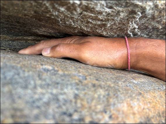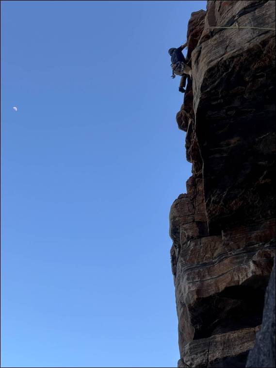 Even more so when he said things had been ‘niggled’ by yesterday’s 9km run. With the ever increasing distances the technology will instruct him to complete the niggles are a bit of a worry. It seems that it is not just me that has to make some sensible decisions. Fortunately the rock hopping did not aggravate his niggles, and we soon arrived at our destination. Here I started the proceedings on a route that has, in my opinion, one of the most comfortable jams of any route. With a perfectly sized crack, for my hand, that has smooth yet grippy rock: