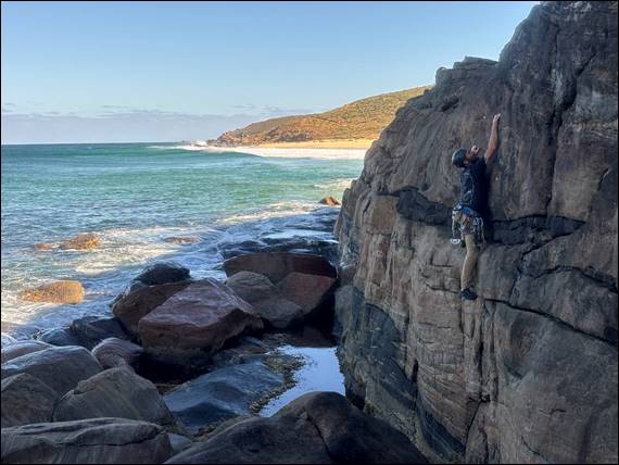 Being rationale I left Howsie to tackle the harder of the moderate routes here. Allowing him to enjoy the exposure that seems so out of balance for such a relatively small crag. Then before my second lead I was maybe not so wise. Prior to today the far northern wall, which is even shorter, only had one line on it. A significant back story about that climb is detailed in this past post https://sandbagged.blog/2015/10/09/no-longer-scarred-for-life/. Much to my joy the tide and swell defied today’s forecast, and the normally wave washed wall was dry: