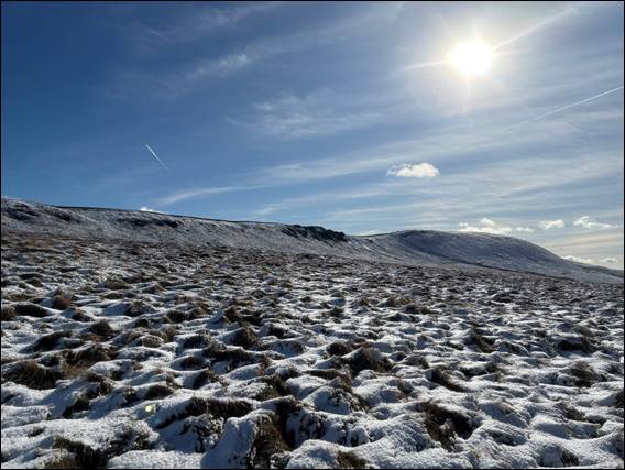 Dave suggested it should be fine, so we went for it. He was mostly right, but ice did indeed exist on some of the steeper hills where the sun had not got to. I kept a careful eye out, and on occasion it was not possible to avoid the wheels spinning. Luckily for us these sections were short lived and we were able to safely navigate our way along. Being a Saturday throngs of others were out. Above is Cats and Shining Tor, where Dave and I had hiked over only meeting one person. Today, as that local had predicted, it was like a highway: