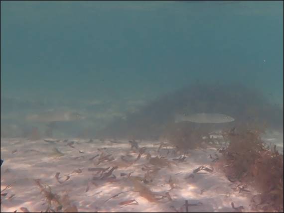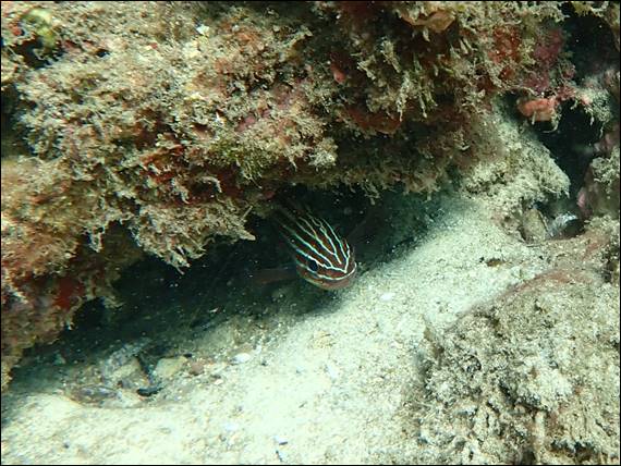 I have found have all species of Bullseye to be generally pretty skittish. Today however they were more accommodating to my intrusions than I am used to. Above are two Rough Bullseye (Pempheris klunzingeri). Very different in appearance to the Bigscale Bullseye, with a body of pale bronze to coppery-brown. With this colouration I almost felt the juvenile I spotted could be from this species but my research indicates that is not the case. While a common find below are Western Striped Grunter (Helotes octolineatus):