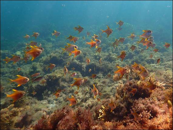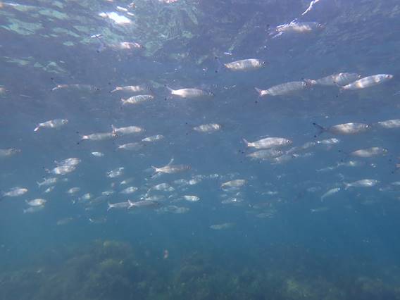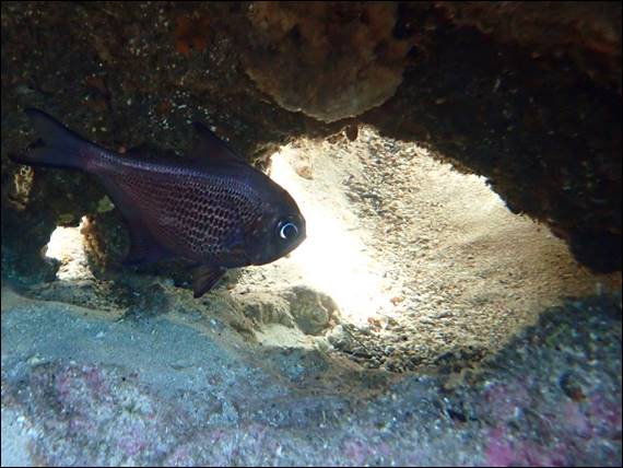 If you look closely you can see one young fish that is quite different, being a juvenile Bigscale Bullseye (Pempheris multiradiata). It is described as having a bronze to yellowish tinge along its back, to my mind it looks orange, and distinct yellow pelvic fins with black tips. The rest of the body being translucent. This creates an illusion of a half-eaten body. Believed to be a form of camouflage developed by this species. Very different in appearance to their adult form shown above, this one being approx. eight inches but they can grow to a full foot: