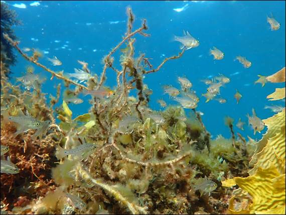 Next are juvenile Western Pomfred (Schuettea woodwardi), with a couple of mates hiding amongst them. After all there is truth it the term safety in numbers, especially when so young and vulnerable. Western Pomfred display yellow in the body when young and that shifts to silver as they age. Adults have yellow colouring mostly restricted to the edges of their fins. These are multiple batch spawners. A single fish can produce young several times within a single season, with the spawning often being associated with the lunar cycles: