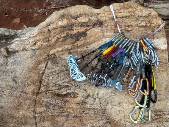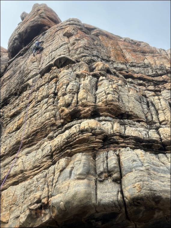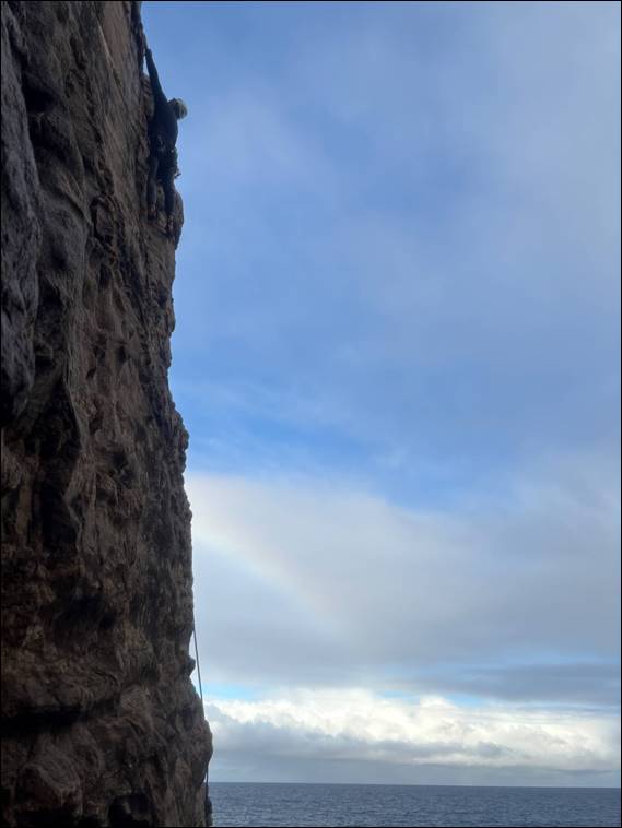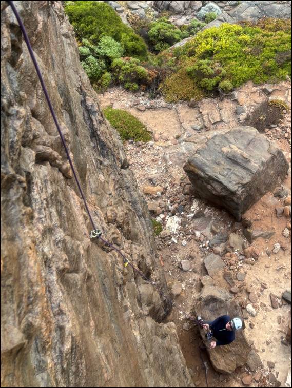 While there were a few more sprinkles to come, as the morning rolled on they mostly reduced in intensity and frequency. And we also rolled on, the showers didn’t hamper our pace. Helped by having picked spots to allow raps back down and reasonably quick set ups for belay anchors, we soon had four fun lines under our belt. The image below of Craig coming up that fourth route may be a bit fuzzy, but my phone and I were aligned on the focus needing to be on the brew that Craig had poured just before coming up: