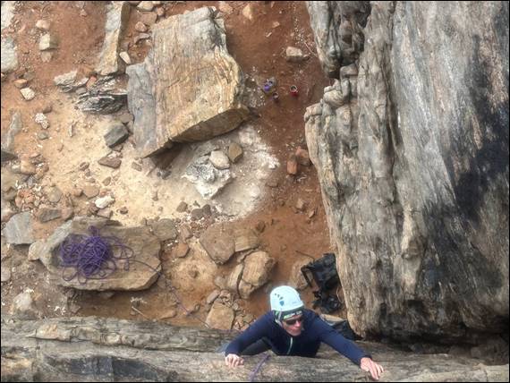 We arrived to find the rock faces pretty well dry, other than the seepage areas. Seeing I had taken the first lead with Howsie yesterday, I felt it only right to offer up the first climb to Craig today. Being more of a statement than an offer, which he didn’t seem to object too and promptly sailed up the first route of the day. As I reached the top out to see a wide band of rain was coming our way, but we were prepared for this. We rapped down, made sure the gear we weren’t using was undercover, and then I set off: