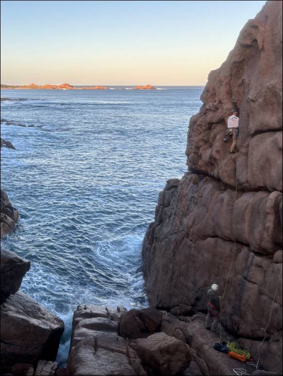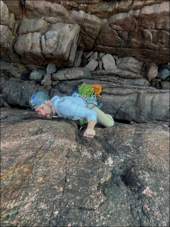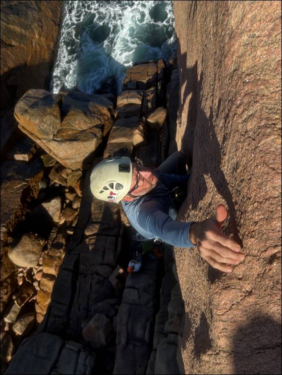 And while the prior thoughts of what might be led slipped by a few grades, quite a few for some, Smith Beach still packed a punch on the lines we did hit. Keeping us honest. Watching the three of us climbing the above line, including me slipping off it, didn’t inspire David to have his first taste of climbing at Smiths Beach. However, he was keen to don his harness and boots for the below climb. Unaware of how Rongy, even at full stretch with his gear just below his feet, was only just able to reach what some may described as not being a hold: