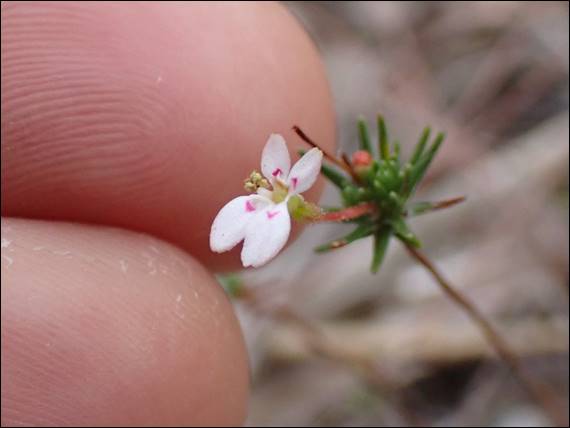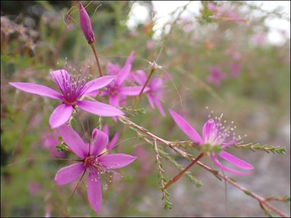 While there were greys above, down at ground level there were some specks of colour to be found. The deceptively named Pink Summer Calytrix (Calytrix fraseri) were the most abundant of the blooms to be seen. Deceptive as they flower for an exceptionally long period from November to August, so nearly year round. Also while the ones I found were pink, their flowers can be found in cherry, purple, and sometimes yellow. The only part of the name that does hold true being Calytrix, derived from two Greek words of calyx (cup) and thrix (hair):