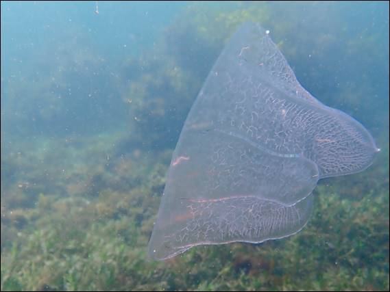 I was also pleased to come across one of the largest species of Comb Jellies (ctenophora). With an estimated 60 species in Australian waters, approx. only 35 have been named. This being one, the Winged Pocket Comb Jelly (Neis cordigera) that often exceeds a foot in length. I’ve previously talked about how they propel themselves using tiny hairs called cilia. Comb Jellies are the largest animals to swim using this technique. Another distinguishing feature separating these from jellyfish is they do not have stingers. They do however have colloblasts: