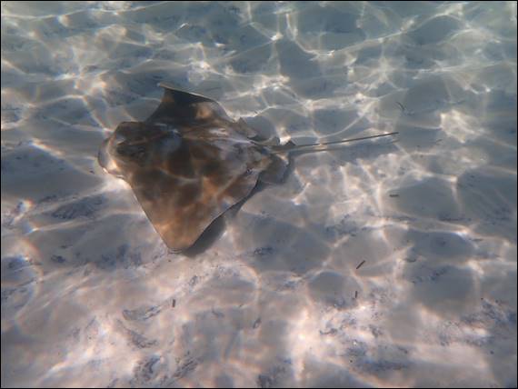 Lisa replied to them that she is used to me heading out solo, and has ‘given up’ worrying. Before I got that far out, in the relative shallows, a Southern Eagle Ray (Myliobatis tenuicaudatus) lazily swam underneath me. I got the feeling it was watching me with as much interest as I watched it. Aptly named, as it swims by flapping the pectoral fins up and down. This is different to many other rays, which use an undulating motion. It is also different in that it has a very obvious frog-like head and duck like bill, used to hunt for prey in the sand: