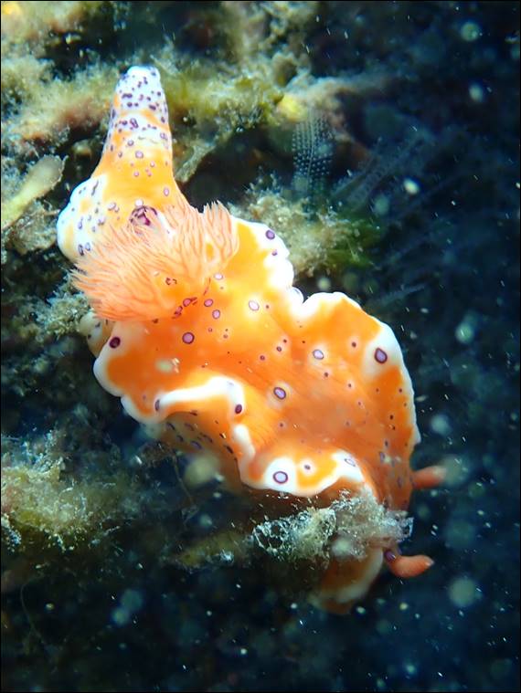 Quite a few other locally found rays use the same method of ‘hydraulic mining’ or ‘hydraulic jetting’, to uncover buried prey. None of them however display the same, or even similar, modified head to assist with this process. I was even more chuffed when I came across a solitary Short-Tailed Nudibranch (Ceratosoma brevicaudatum). It’s not been a great season for finding these colourful creatures. This species grows up to half a foot in length, and is one of the largest nudibranchs commonly found in Western Australia. But not the biggest: