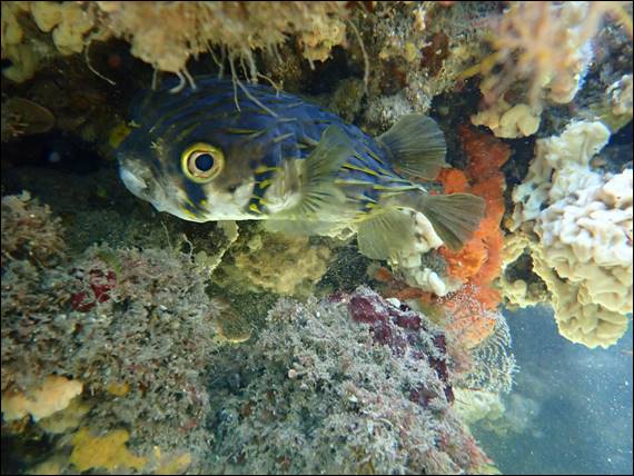 That title is held by the Spanish Dancer (Hexabranchus sanguineus). Not one I am likely to see, as it is found in the tropical waters much further north. It is also quite elusive being primarily nocturnal. Despite the varying ground I covered and how far out I went, it was again surprisingly quiet on the fish front. The only image I’ll include is of a Globe Fish (Diodon nicthemerus), hidden in a cave and unable to escape my camera. I did however come across a heap more Southern Crystal Jellyfish, including one that had a tiny fish hiding in its bell: