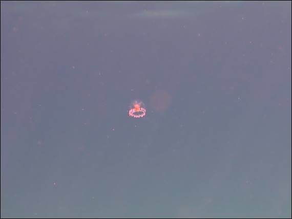 While jellyfish have cnidoblasts. Both are similar, comprising a spring-loaded spiral tether that shoots out to capture prey. Cnidoblasts are harpoon-like and deliver a toxin to immobilise the prey, hence the stinging sensation we can feel to varying degrees. Whereas cnidoblasts form a sticky pad after firing, as the granules at its end rupture to quite literally glue itself to its prey. Next was my first sighting of a jellyfish of the Aequoreidae family, or many-ribbed or crystal jellyfish. There are a quite few species in Australian waters, and can be difficult to identify: