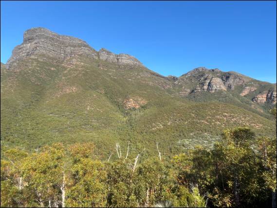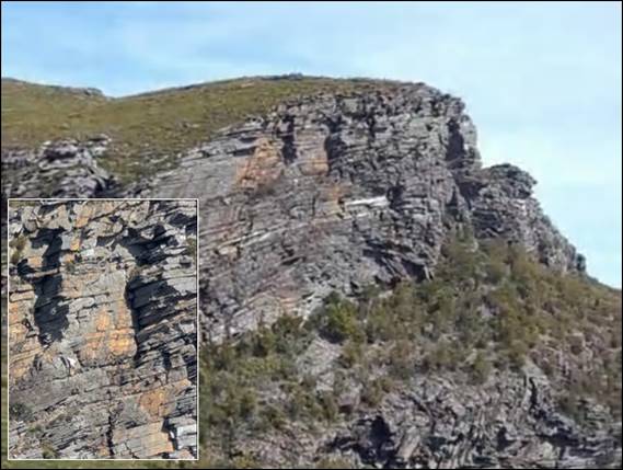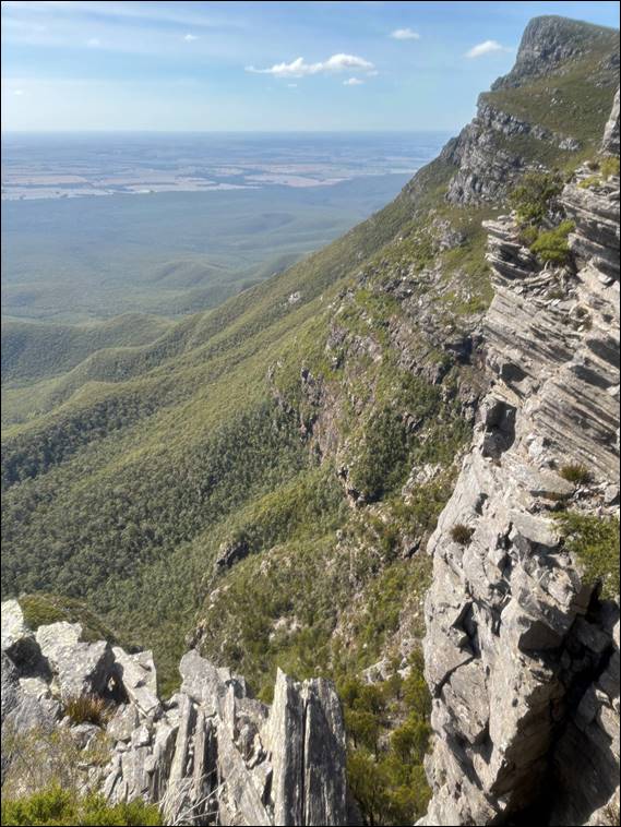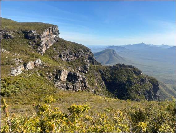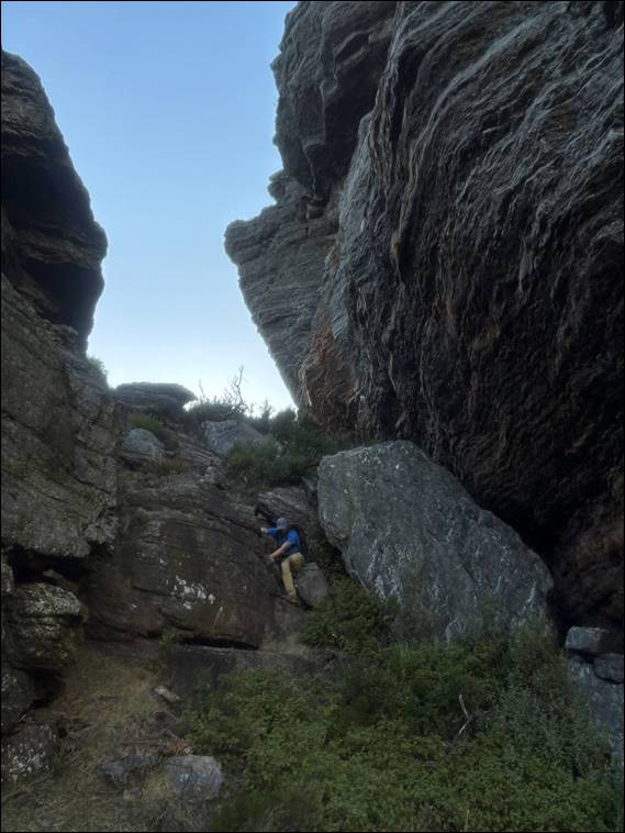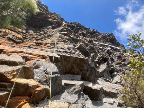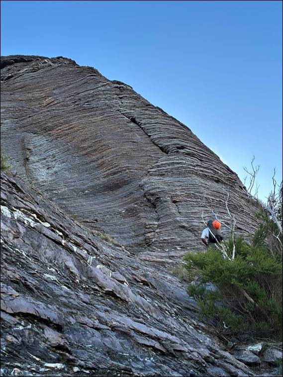 Onwards we went. Along a ridge and then down to round the edge of The Fortress. As soon as we got up close and personal it loomed some plus 70m above us. Looking steep and overhung in many parts. Mount Trio comprised geological features of folded sedimentary rock that was relatively homogenous, which gave it a crag like feel in comparison to this spot. The Fortress, like the nearby Bluff Knoll, comprised folded and faulted quartzite, sandstone, and shale. The blocky nature looked less stable and along with its steepness was intimidating: