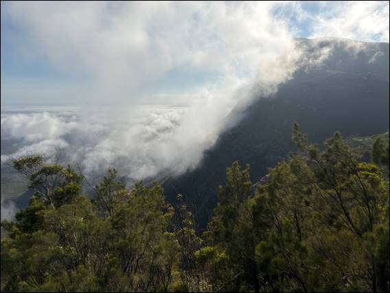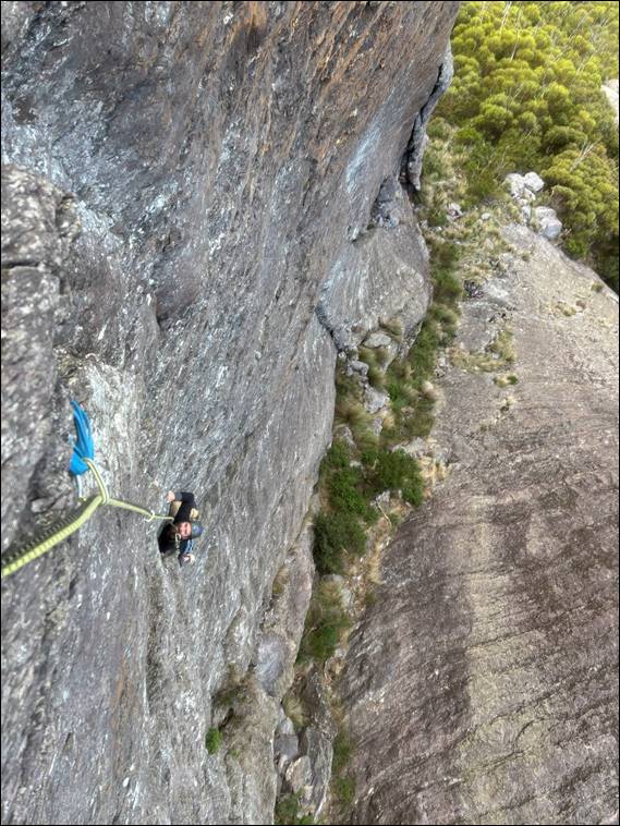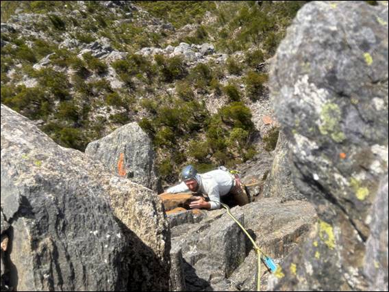 Decision made. We packed up and hoicked it back to the main track. Practically running, we passed lots of people sweating their way up and anyone heading down. Saying hello to everyone we passed, and just about everyone was cheerful and happy. When we went to pass Success and his partner, who were heading down, they asked if we were the ones they had seen climbing. Indeed we were, and he kindly provided me with a couple of photos he took of Howsie just starting up the second pitch, which I have used three images up: