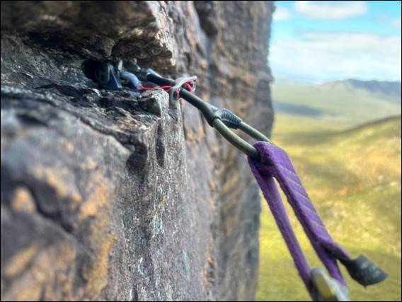 We both felt it. There is however only one way to see if it was just in our minds, and that was to get on and climb. We racked up with Howsie taking first lead today. Taking on a relatively new route from 2003 called Coyanacorna. No surprises that this one star route was graded 16 (HVS 4c/5a), which seemed to have become our staple grade. The climbing felt more nervous and it was not as easy to read if the rock would stay in place. It did but care was required, checking for cracks indicating weaknesses and at times avoiding bigger unattached blocks: