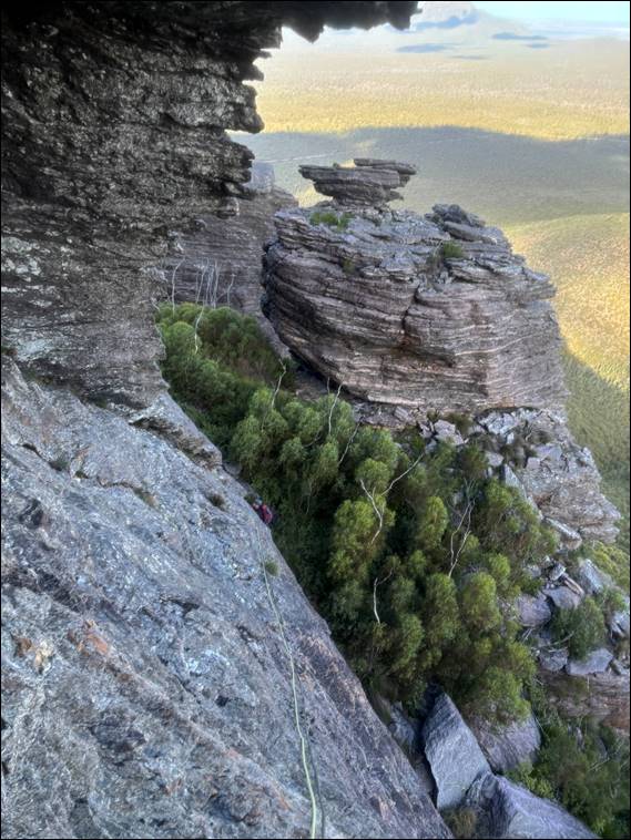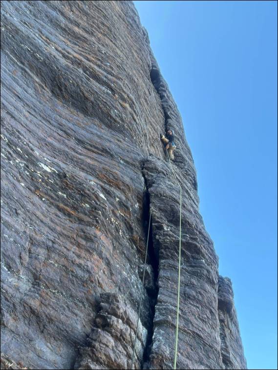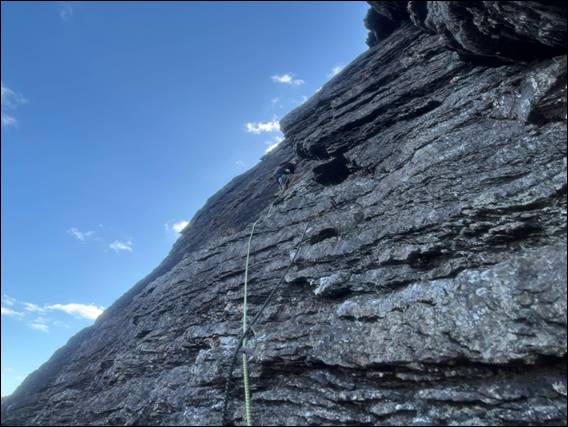 The climbing is a bonus, and for this route a sobering thought was that when they established this climb and gave it a lowly grade 12 (S 4a), they had no camming devices. Something we made lots of use of. Hopefully, you are following the images as I slowly catch up. Howsie took the second pitch, which was equally stunning. Only awarded one star, we considered with two brilliantly absorbing pitches it was the best of the four lines we hit here. Howsie then took on the next lead, being drawn in by the obvious and main feature of the wall: