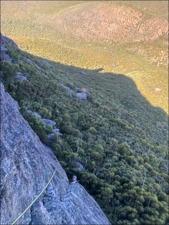 Staircase is given grade 4 (not quite a M in the UK system). Listed as a long five pitch route, and a good beginners climb. First climbed in 1966, so we climbed it on the sixtieth anniversary of the first ascent, which was pretty epic. As was the line, those old climbers were bold as brass. The gear was scant, even with camming devices which they had none of. I’ve included an image of Howsie following up the first pitch, in which I challenge you to find my gear placements. And an image of Howsie going up the second pitch, which did have more gear: