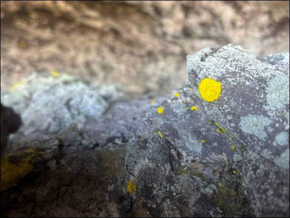 After finding the above scramble, it was back down the hikers track. Arriving at the Mount Trio Bush Camp as light was fading from the sky. We definitely made the most of our first day. Bob will be happy to hear we managed our old goal of a 1,000ft of ascent on rock, with some 340m (1,100ft). While I have rambled on with some climbing talk I have included a few images to show the rock texture, which varied quite a bit on some lines, and scenery. Also an image of what I believe to be Sulphur Dust Lichen (Chrysothrix chlorina):