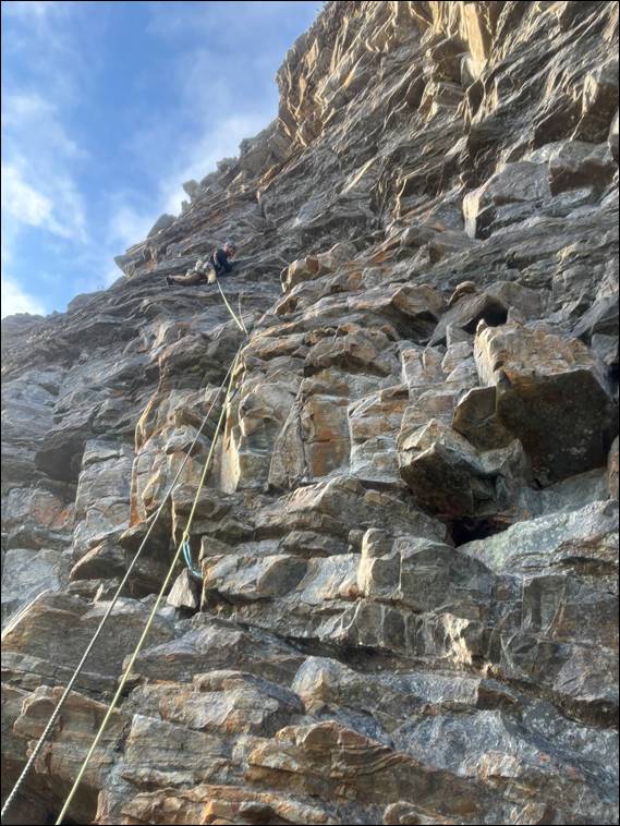 We climbed it with packs, making it even more fun. But it is certainly not a beginners route due to the long runouts, even if they came up on second they would risk a big pendulum fall on the first pitch should they slip. We loved it! Better still it went on, and on, and on, and we reckon it went for close to 180m. A brilliant way to end the first days climbing, on what is described as ‘the original route of the mountain and one of the first in the Range’ (the first to be written up that is). The day was not over yet and first we had to get off the peak: