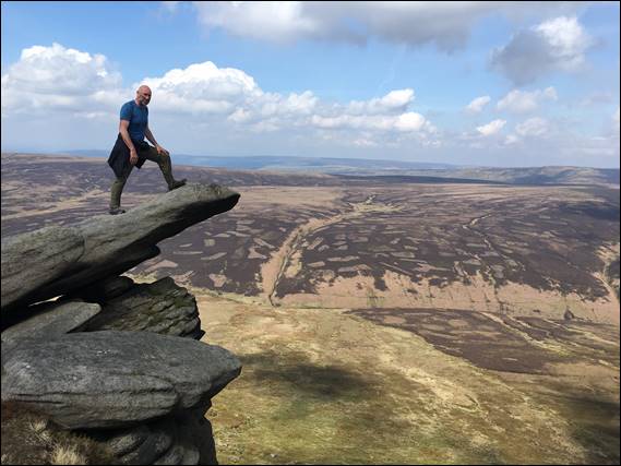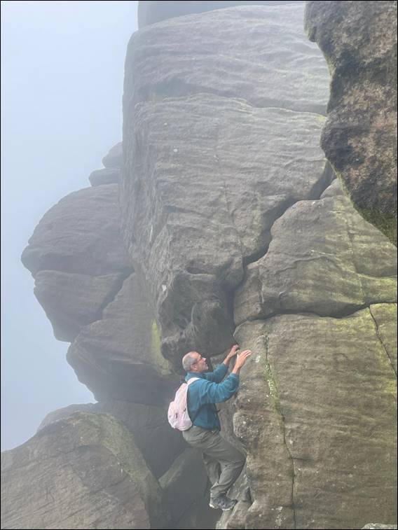 You may notice the trig point is not as high as the highest point on Kinder Scout, by ten feet or approx. three meters. The highest point does not have a trig point, and is merely marked by a mound of grass and small cairn. But once on the edge of the plateau the views are equally stunning from all directions and heights, so while we didn’t reach that extra ten feet of elevation it made no difference to the experience. You will also have seen that I got to play on a bit of rock, holding myself back from going too high as Dave watched on nervously:
