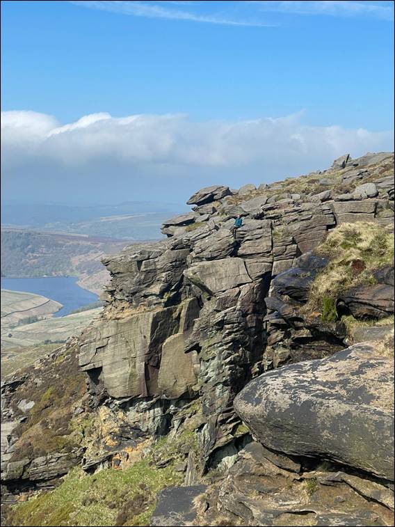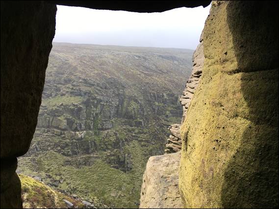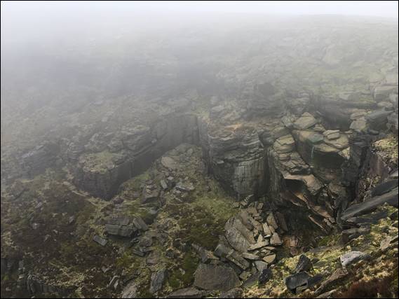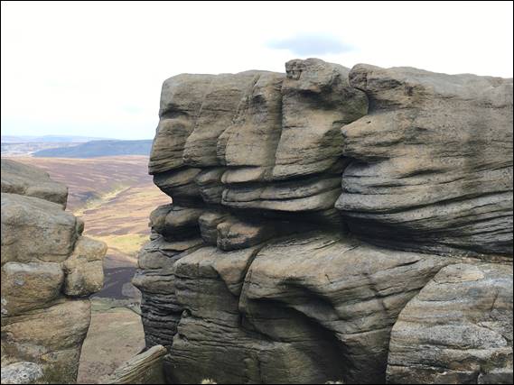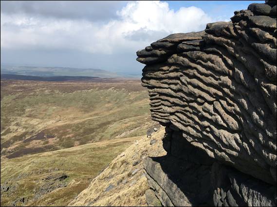 It looked like one egg had rolled out of the nest, precariously sat on the edge it was probably done for. We ate some food at what seemed a safe distance and out of sight of the nest. Not far enough obviously, as the kack-kack-kack-kack sound continued so we moved on to leave it in peace. As we followed The Edge towards the top of the steep steps we had previously walked down, we marvelled at the many rock features. Along the way I noticed the patchwork pattern in the moorlands on the opposite side of the valley: