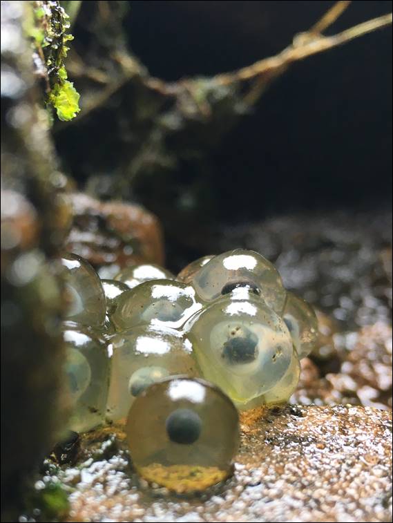 He confessed that this made him ponder his options if things should go south, so was relieved when I got back down. He had even scrambled across to the base of where I had gone up, and I reckon with a bit of encouragement I could easily get him into scrambling and maybe even climbing. Back at the packs I spotted the above spawn in a crevice where the water was splashing up. We weren’t sure if it was frog or toad spawn, but it may be frog spawn which is laid in clumps as opposed to toad spawn that is laid in strings: