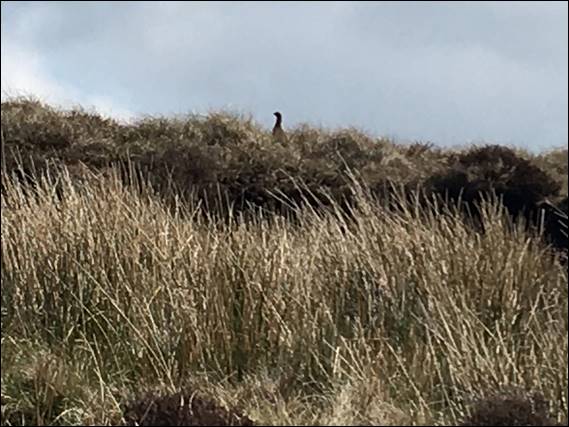 Many of these pubs have their original name and have sadly been turned into bed and breakfast places, but we walked on regardless. Listening out for the familiar calls of the more common moorland birds such as the Skylark (Alauda arvensis), which true to its name came out to play in numbers when the blue skies came. The distinctive bubbling call of the Curlew (Numenius arquata), which we heard but only saw on occasion. And then there were the Red Grouse (Lagopus lagopus) shown below, given away by the fleck of red on its head: