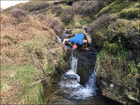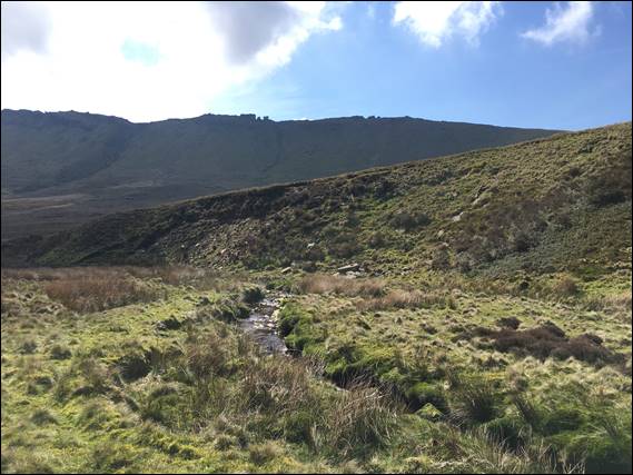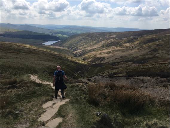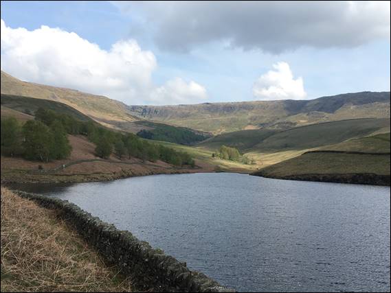 This trip however, I went by myself, there were no bugs to hold anyone back, and the weather forecast was looking favourable. So Wednesday morning I was being picked up at six thirty from my folks house, where Dave first had to apologise to my Mam for moving to a different delivery round. Something that had happened pretty quickly, so he did not have the time to say farewell to all the locals. Then it was a quick thirty minute drive to downstream of Kinder Reservoir, where we shouldered our packs and continued on foot: