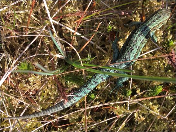 So for a second time we went off track, deciding to take a rising traverse up the side of the valley to reach The Edge. The rocky skyline shown two images up. We spied a section that wasn’t guarded by near vertical rocky outcrops and started our way upslope. With no path we had to be careful on the tussocks of grass, so as not to twist an ankle. Dave saw a movement in one of these and we dropped to our knees looking about to find the first reptile, being a Common lizard (Zootoca vivipara):