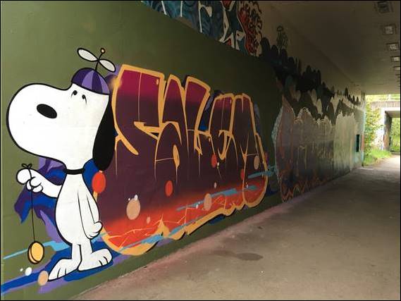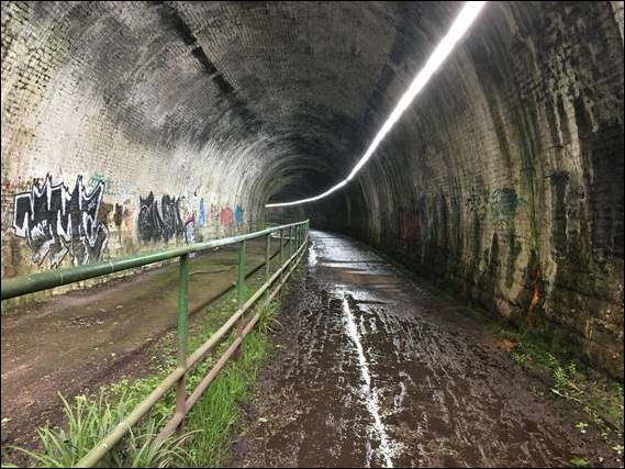 The first image being as I approached Pear Mill, way too early to be able to pop in for tea and cake. The next image is from a series of underpasses that takes you across the first motorway crossing. Colourful graffiti coating every inch of the walls, but none of it was offensive and much of it looked like reasonable street art. The book provides an alternative path to the tunnel above, for those who do not like long tunnels. It is a 156m disused rail tunnel, which was opened in 1863 and is part of a track that has replaced the rail:
