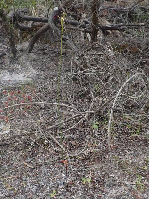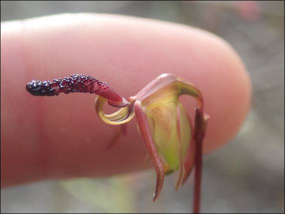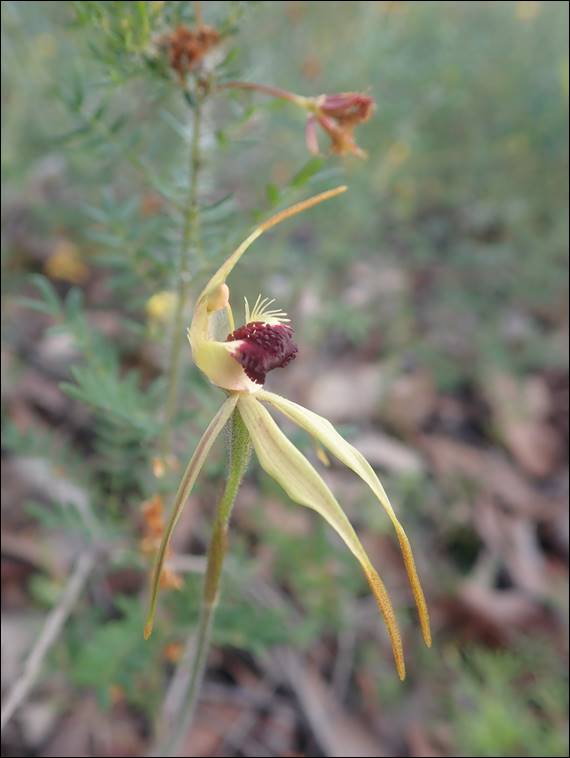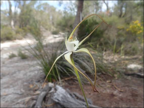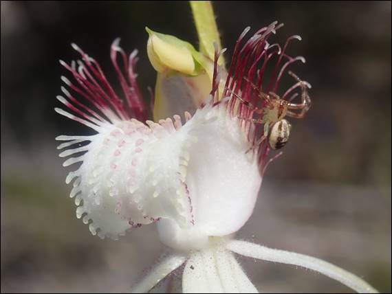 This obviously didn’t put Sarah off and as we were walking down I could see her eyes scouring the scrub on the side of the track, and then the crevices and nooks in the rocks as we got closer to the crag. I mentioned that she might a python sunning on top of the exposed rocks just above the beach, to which she replied that they were probably also waiting for unsuspected sea birds to fall prey to them. I hadn’t thought about this before, but it made sense. As we walked down the path Rongy was also looking out and spotted the above Fairy Orchid (Caladenia latifolia) in the bush off the side of the walk track. We also spied two tour guides, a sign that a group would be turning up: