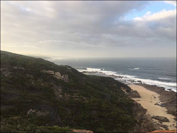 We had a great vista from the cave, which was 12km into the 24.5km walk. It had been a very big and spectacular day, but we were glad to rest up now and didn’t leave the cave till morning. From here we watched clouds start to form initially over Pyungoorup to the east, blowing in from the south. And then slowly engulf the entire view, before the wind started to howl above as we were sheltered in our cave. Dinner came at 5pm and I was in bed at 6pm, soon after the boys were getting cold and they too hit the sack. Next morning I could just make out the morning light through my bivvy bag and looked out to see the clouds this time below us: