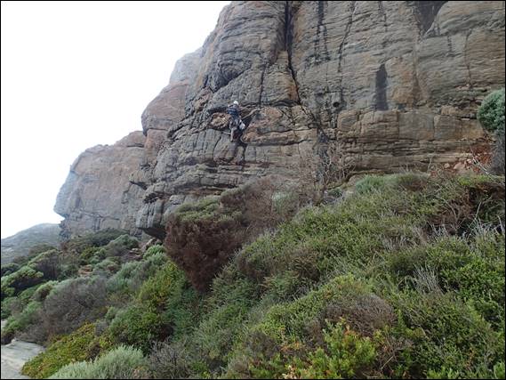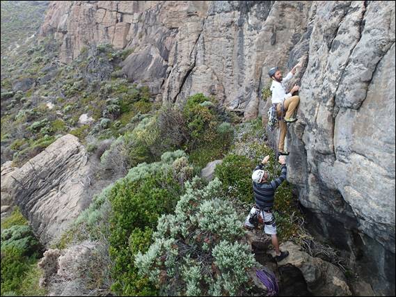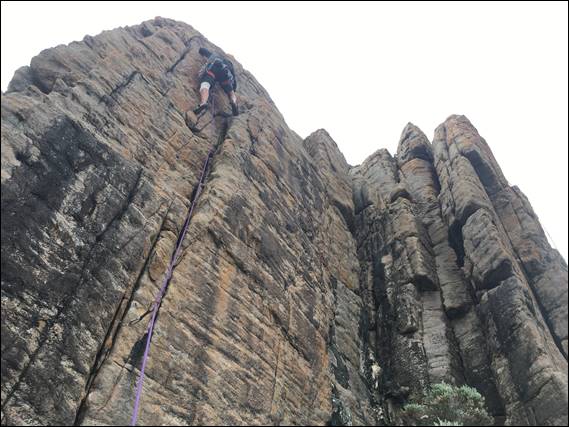 The next images was of us walking through the sword grass, for which some people take gloves to avoid getting cut up. But it really wasn’t that bad, and the level ground was a relief, other than the hidden holds in which we on occasion lost our footing. If you go back to that image and look at the sheer cliffs, behind you might spot some ropes and a climber. Here we came across Jonas and a friend of his. I’ve been in touch with Jonas years back and he has invited to take me climbing in the Stirling Ranges, which is where he seems to spend most of his free time. But this was the first time that I have met him, so it was great to meet him and even better to meet him here: