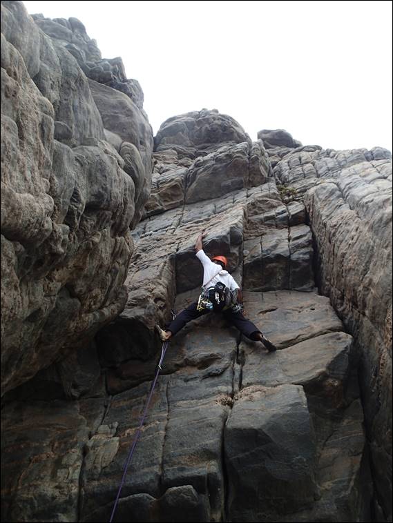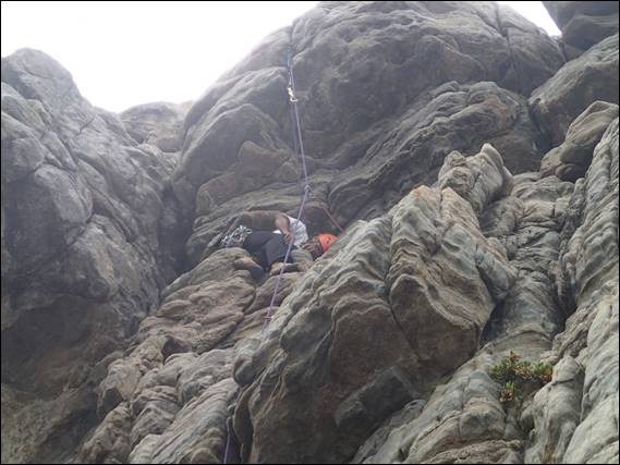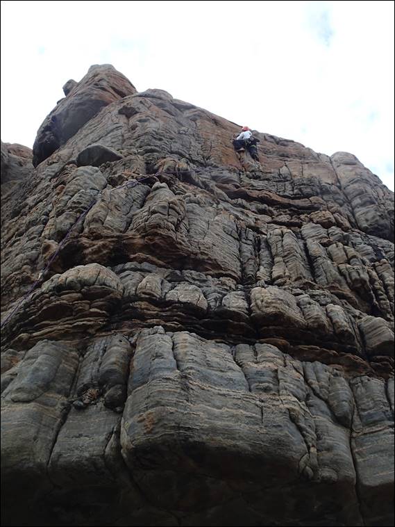 So we were pleased to be setting the belay up as a top rope after each route had been led. We moved leftwards, next up was Candy Floss and then Brepus. I was curious and checked what brepus meant, and felt it is probably best not to include that on this post. While short these routes are fun and allowed Josh the chance to try an arête, face and then crack-chimney climb. Each requiring a different climbing technique. It was also a chance for Josh to check out the protection we were placing, admittedly the first route didn’t have much on it and in fact when Howsie led the chimney he put equally few pieces in:
