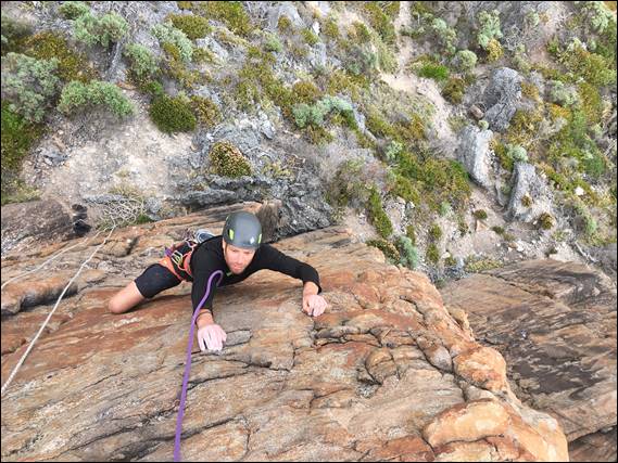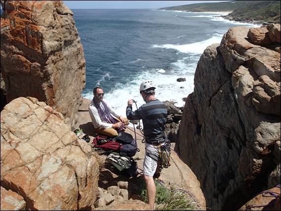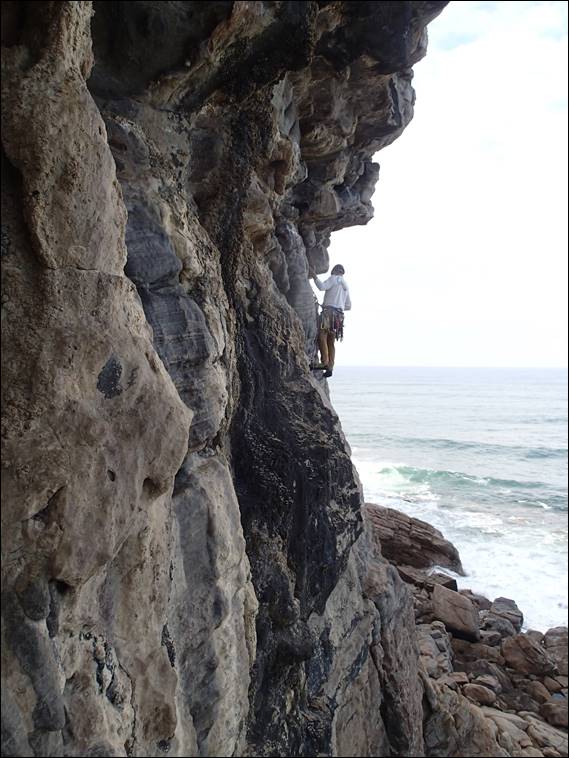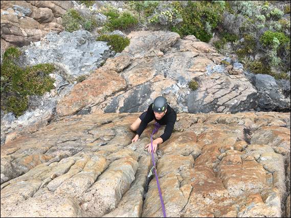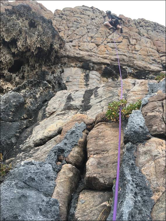 We drove in separately today, as I was meeting Lisa afterwards in Busselton, needing to keep an eye out for roos on the track in. Today we set ourselves up at the southern end of the crag and spent the whole morning mostly having fun on a number of the shorter and easier lines. Normally this end would have a group or two playing on these lines, but today we had it to ourselves. Maybe the promises of another hot day had kept everyone at bay. We started in a route Andrew and I had established way back, Grotesque: