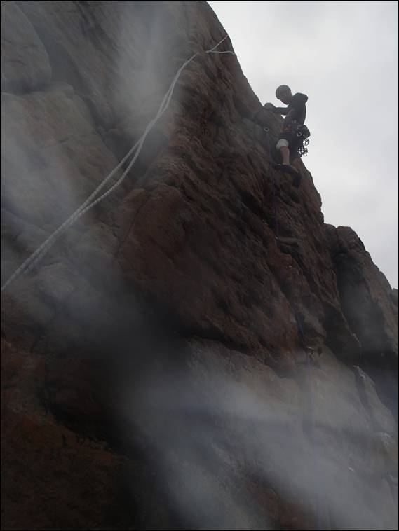 I ticked off the first easy lead on Dry Reach, and then Mario picked Heaven Calling. This route spooked him a bit because of the last piece of protection. The same last piece that Reaper Man uses, which was when he began to understand why I had not yet led it. While taking the above image of him on this route I thought the camera lens needed a clean, but sadly not. Neither of us could figure out when it had happened, but after years and years of swinging off my harness and being bashed around the lens of the camera had taken a fatal knock. It is finally time to put my trusty camera to rest: