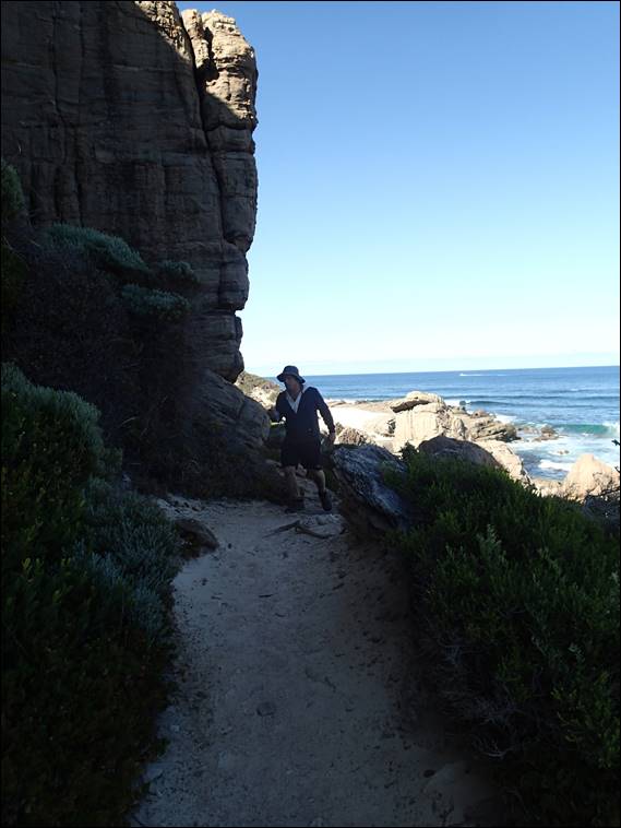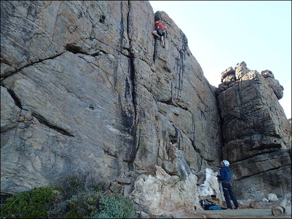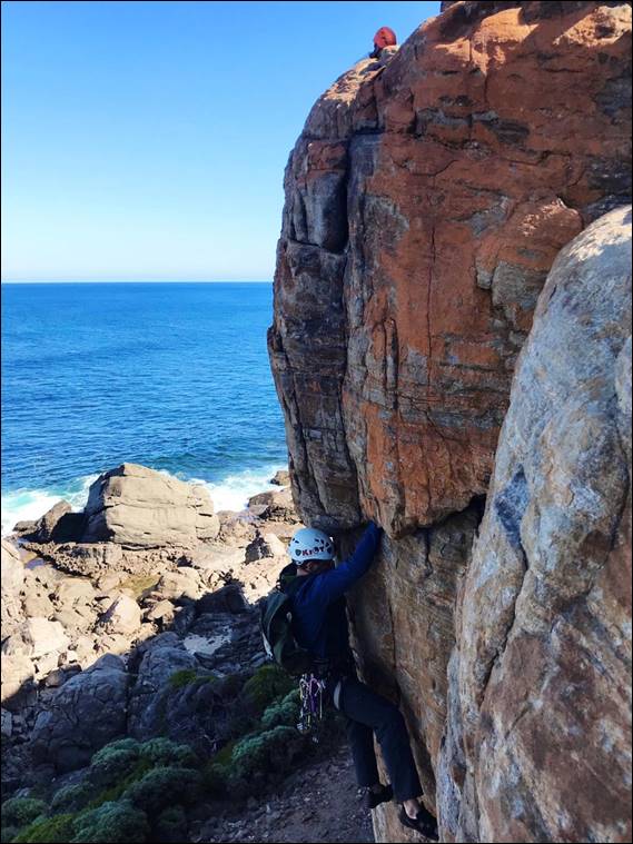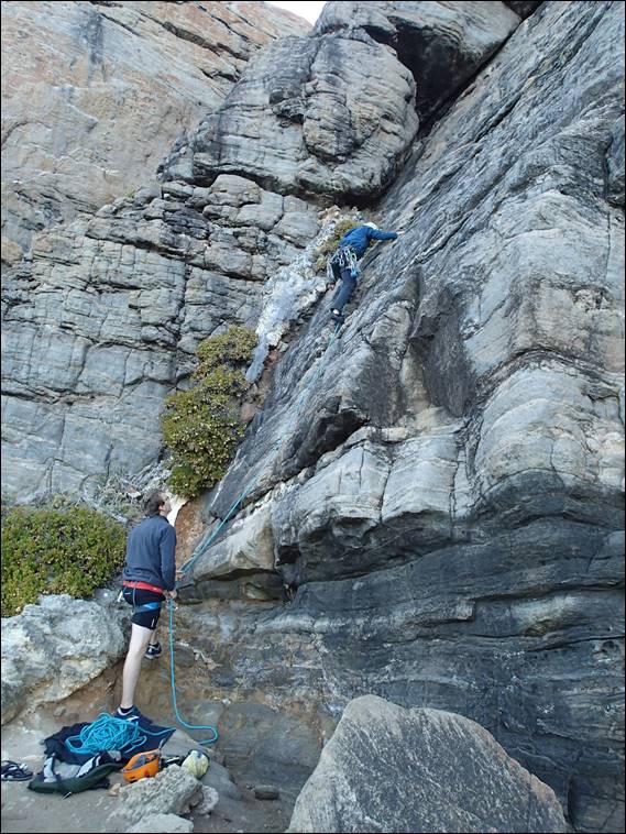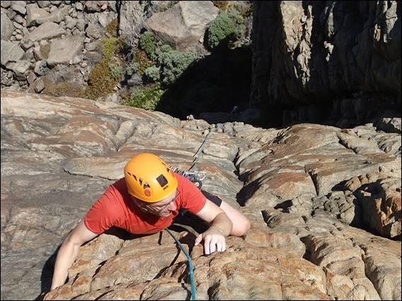 I have to confess to having huffed and puffed along the traverse, stepping high and having to use unseen hand jams while making use of the better higher footholds. It’s a pumpy line and steeper than it looks, and I was grateful when I got to the end. Alan took one look and decided that this was not for him so only Rongy followed up. Below on the rocks Steve had collated all his gear, but he was missing. We were not too worried as he wouldn’t have got far and so we moved on for the next line: