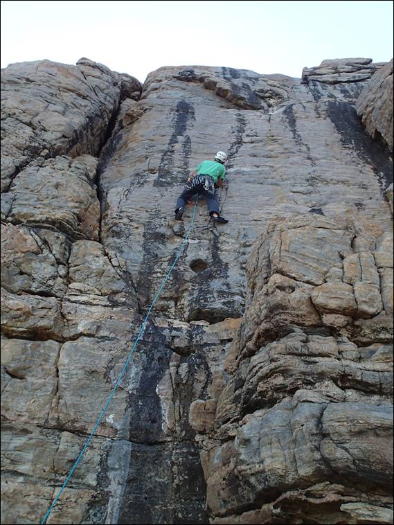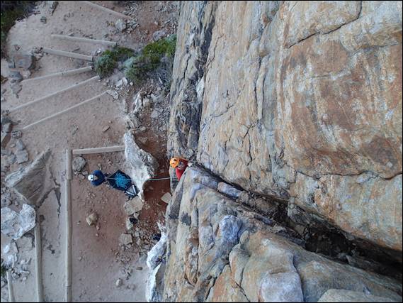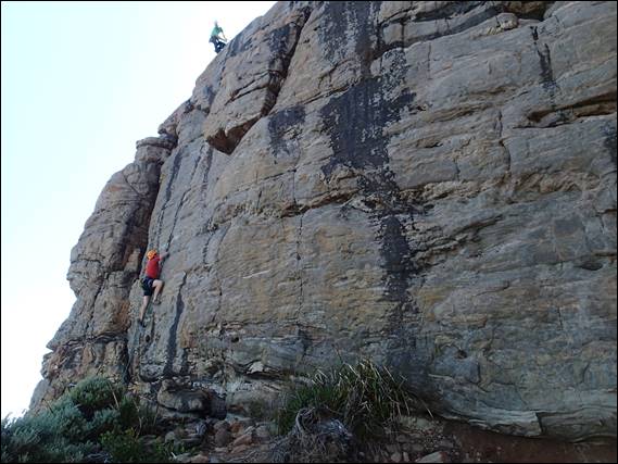 Alan came up second tied in part way along the rope, and while we had a 60m rope this route is so long that Rongy had to start climbing before Alan had topped out. You can just make out Rongy with his white helmet getting to the top of the crux corner that guards the more relaxed upper wall of this route. With that climb under our belt we went back down and packed up, Steve was ahead of us having got ahead start as he was starting to feel the heat. It was a warm hike out and we finally found the missing man under the shelter of the trees by the car: