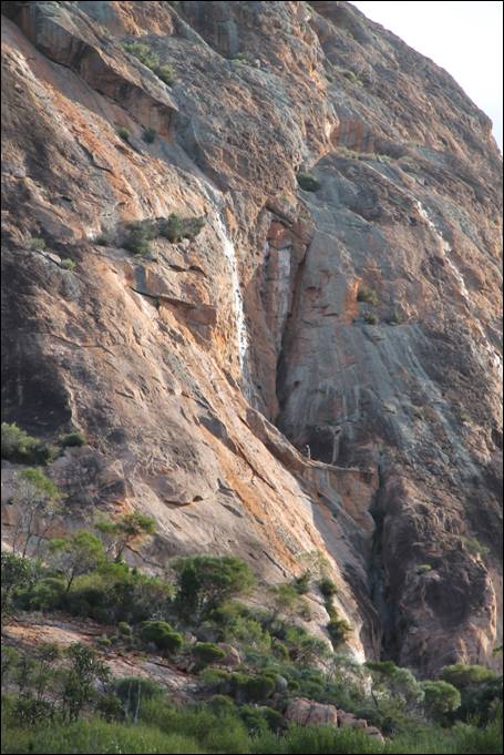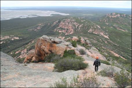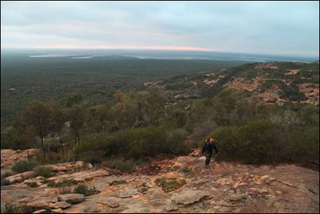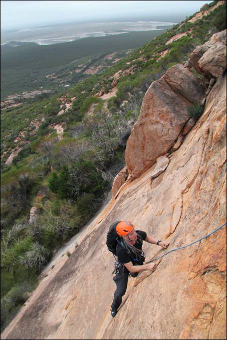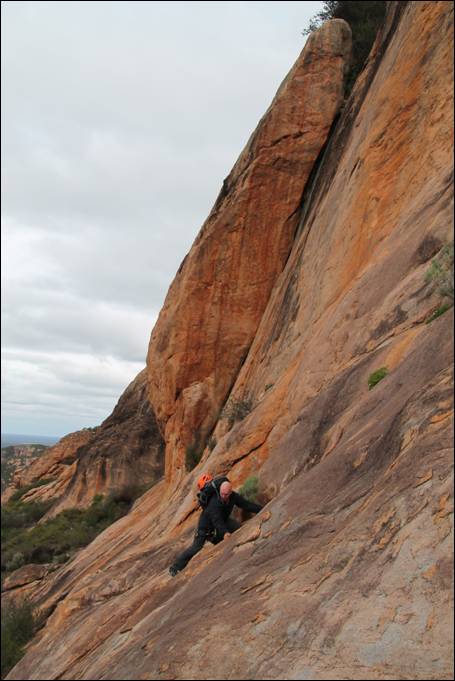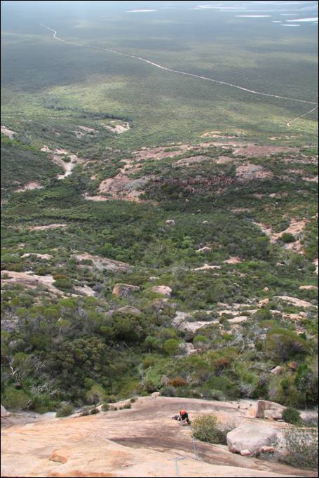 To get to the base of the climbs involved a walk of an hour plus, mostly up steep bushy country. The big day was a 250m’ish climb up the front face of Bluff Knoll. The climbing is more like Alpine climbing with lots of blocks, ledges, loose stuff and interesting route finding: