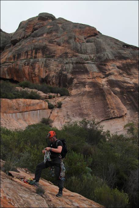 Day three and another time for Steve and I to head to the big walls, while Chris and Ryan went to find a small crag with some harder lines as they wanted a day without the big walk in and out. This time I was after a bit of self indulgence, as there is a climb called Juluka – grade 18 (which is the name of a south African band that I really like) that I didn’t manage to get on with Craig. To get there however there is an hour walk in followed by a traverse climb to get into the gully where the climb starts. Here Steve is setting off to access the gully: