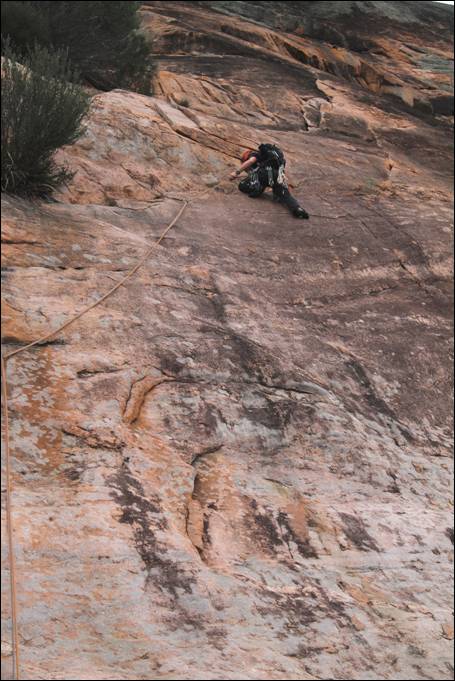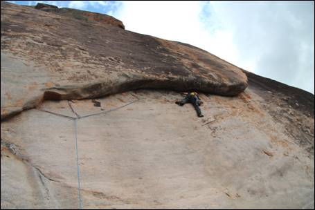 Day two and we decided on a slightly different approach. We picked Kwelaman a great grade 16 slab climb that has belay anchors that would allow us to abseil back down so we only took one pack up for food and drink. We intended to do the first four pitches (the best) and I set off on the first loving the thin moves, steeper terrain and at time run-out sections. Steve followed up in great style but it messed with his head big time and he had to breathe deep to control his fears: