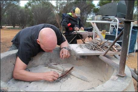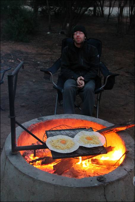 Then as went round to get them out of their tents and swags, Ryan said that he wouldn’t be up for going climbing as his eye was swollen up. He managed to spike his eye with a branch as they walked through the bush to get to the crag where Chris had fallen from and it had taken a turn for the worse overnight. Here he is looking none too good. On another note on cooking on the hot plate are two of Steve’s original and very tasty wrap with cheese and egg breakfast concoctions: