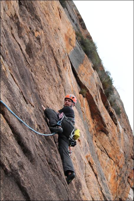 The views were great, and the next morning we hit the crag this time in the shade, making it so much more comfortable – this day the temp rose again to the mid thirties and we may not have known it but it was starting to drain us. There are some great steeper lines including one awesome crack/layback flake line, I did have a bash but it humbled me and I backed off instead opting for one of the steep lines that was on a 50m high crystalline wall that promised to take no prisoners if you, feel off I clung on for dear life and saved my skin this time: